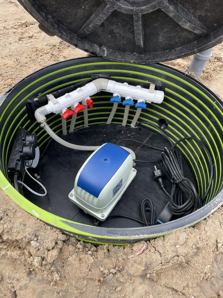 3) В третей камере установлен аэрационный элемент. В данном отсеке происходит мелкопузырчатая аэрация. В процессе аэрации образуется так называемый активный ил (бактерии), который в дальнейшем очищает сток.