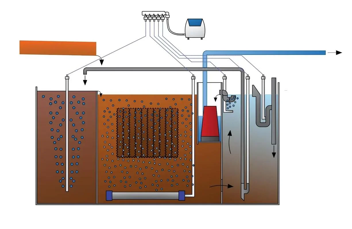4) В четвертый отсек сток попадает через технологические отверстия снизу. В данной камере установлен аэрлифт, с помощью которого происходит возврат ила со дна камеры обратно в первую камеру. В четвертой камере происходит осветление стока, но при этом стоит аэрационная защита, которая предотвращает попадания ила в дренажную систему.